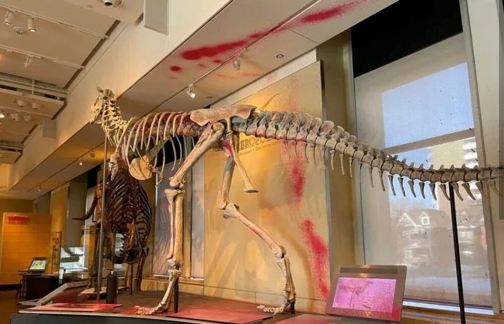 The fossil gallery at the Canadian Museum of Nature in Ottawa is temporarily closed after some specimens got caught in the splash-back of pink paint sprayed by an activist at a replica dinosaur skeleton.