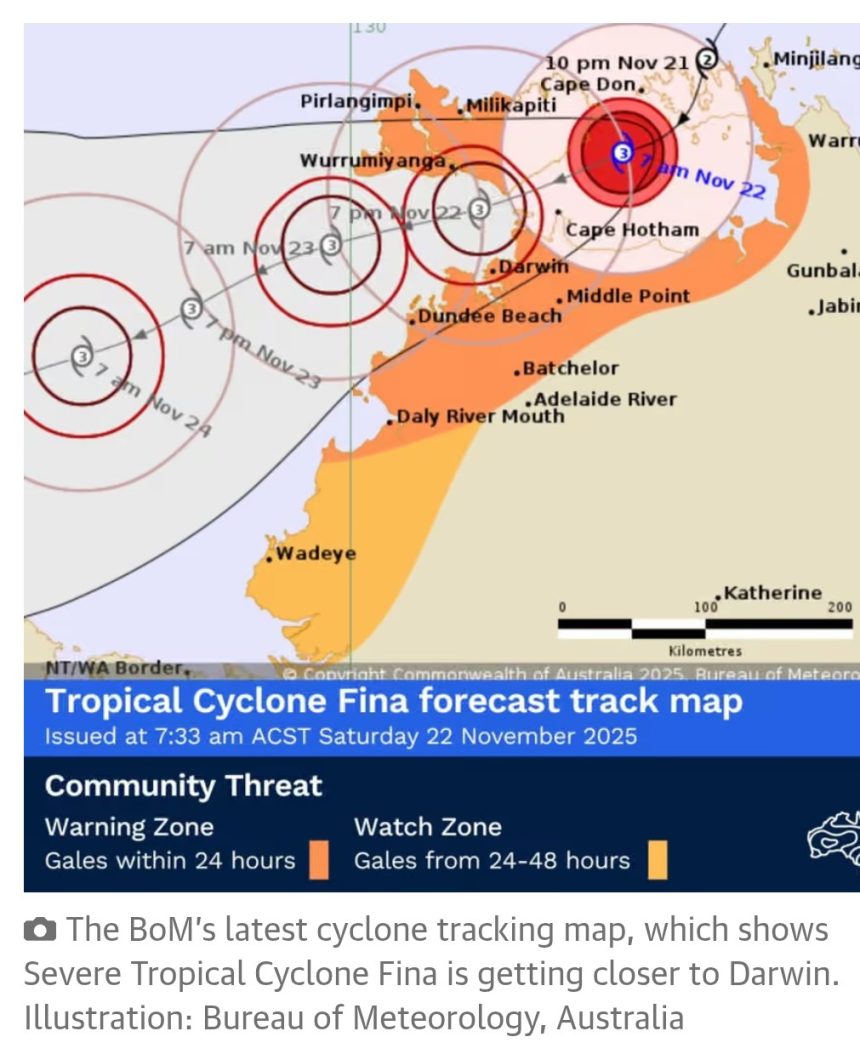 Severe Tropical Cyclone Fina was about 85km to the north-east of Darwin on Saturday morning.
