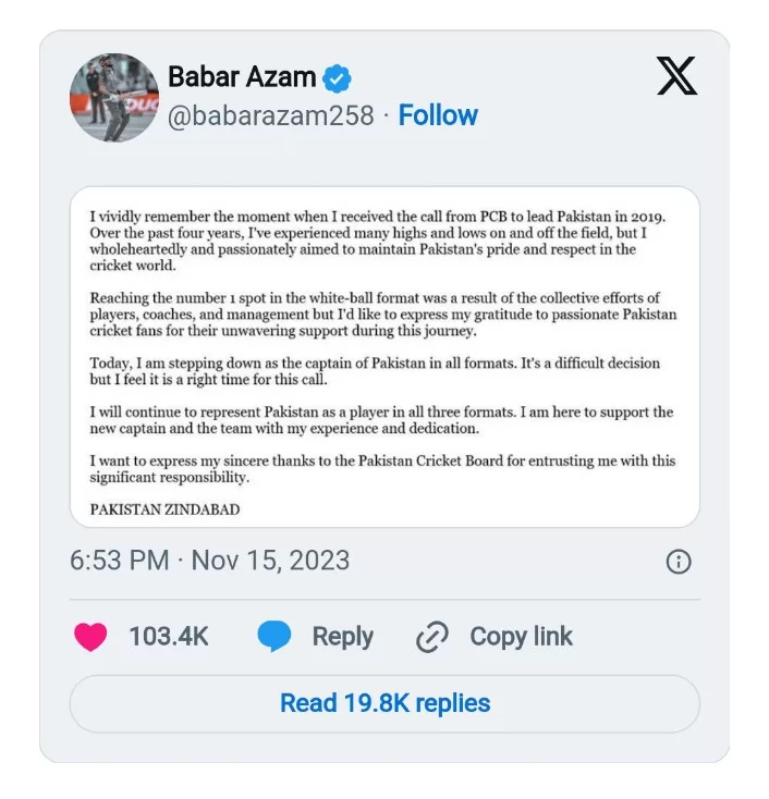 Babar Azam, in a momentous decision, declared his resignation as the captain of the Pakistan cricket team across all formats, a move unveiled on the social media platform X, formerly known as Twitter. This proclamation followed a meeting with the Pakistan Cricket Board’s (PCB) Interim Management Committee Chairman, Zaka Ashraf, in Lahore.