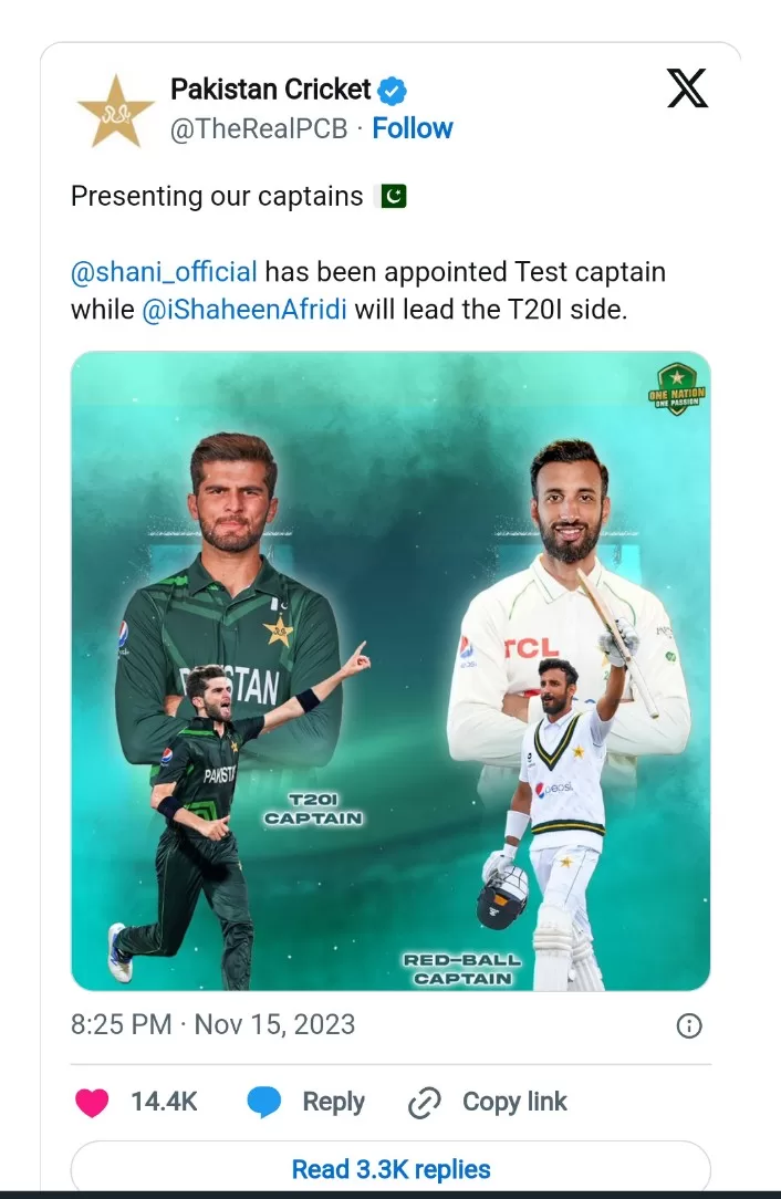 In a notable reshuffle, Shan Masood was appointed Test captain, and Shaheen Shah Afridi assumed leadership of the T20 side. Additionally, former Test captain Mohammad Hafeez was designated as the team director.