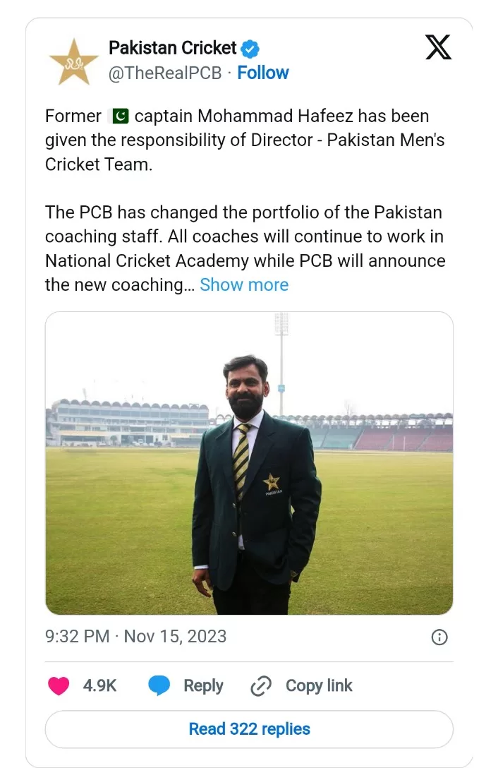 This development comes on the heels of bowling coach Morne Morkel’s departure from Pakistan’s coaching staff following the team’s failure to reach the World Cup semi-finals earlier this week. The PCB is set to announce the new coaching staff for the upcoming series in Australia and New Zealand in due course.