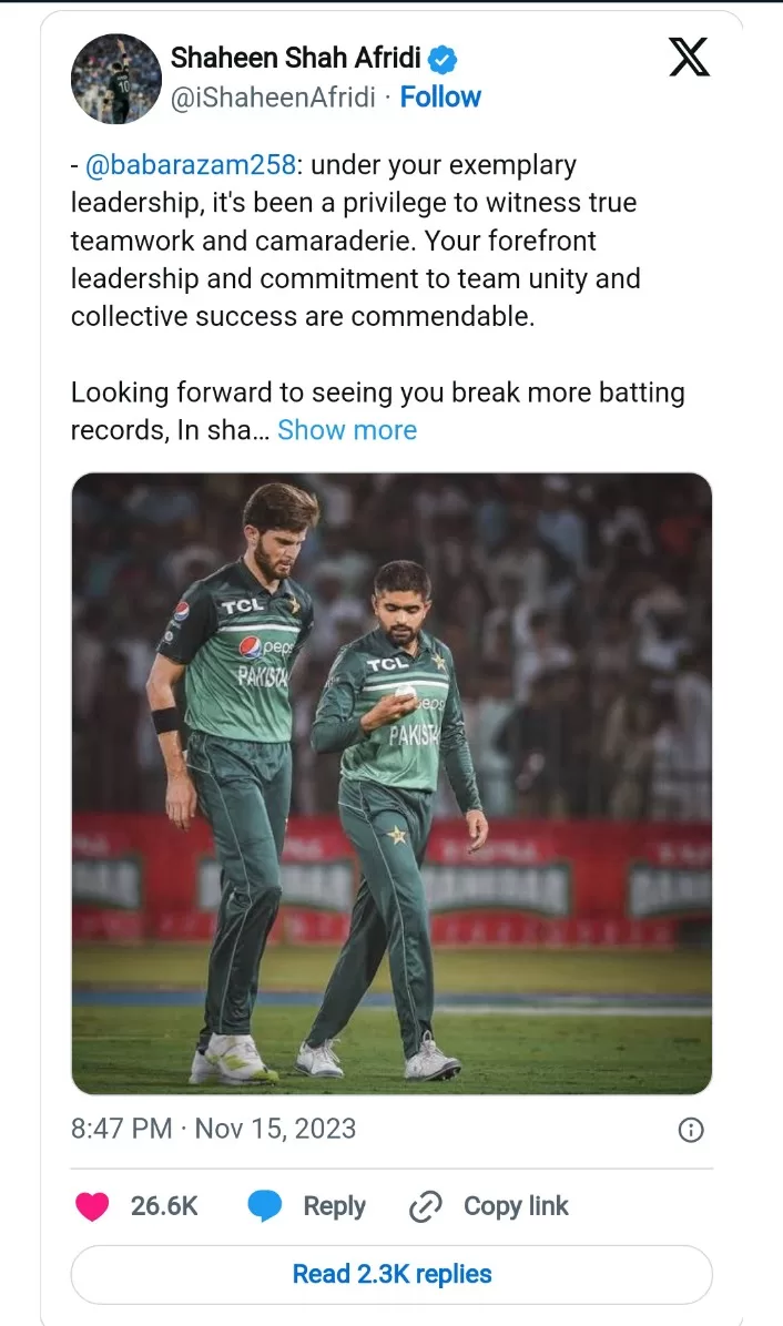 Reacting to Babar’s decision, the new T20 captain, Shaheen, lauded his exemplary leadership, while fellow teammates, including Muhammad Rizwan, Shadab Khan, and Iftikhar Ahmad, expressed gratitude for his captaincy.