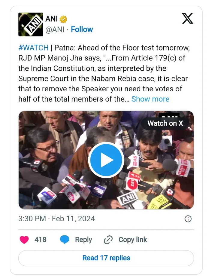 The political landscape in Bihar is undergoing significant changes as the new government, under the leadership of Nitish Kumar, seeks a vote of confidence on February 12. However, before that, the ruling party needs to pass a no-confidence motion to remove the Speaker of the Legislative Assembly. The Rashtriya Janata Dal (RJD) has now posed a challenge to the ruling party, with RJD MP Manoj Jha stating that Nitish Kumar should remove the Speaker before facing a floor test. To remove the Speaker, they would need the support of at least 122 members, emphasizing the precedent set by Supreme Court decisions in states like Arunachal Pradesh and Maharashtra.