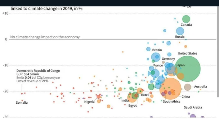 Rich countries will not be spared either: Germany and the United States are forecast to see income shrivel by 11 percent by 2050, and France by 13pc. Projections are based on four decades of economic and climate data from 1,600 regions rather than country-level statistics, making it possible to include damages earlier studies ignored, such as extreme rainfall.