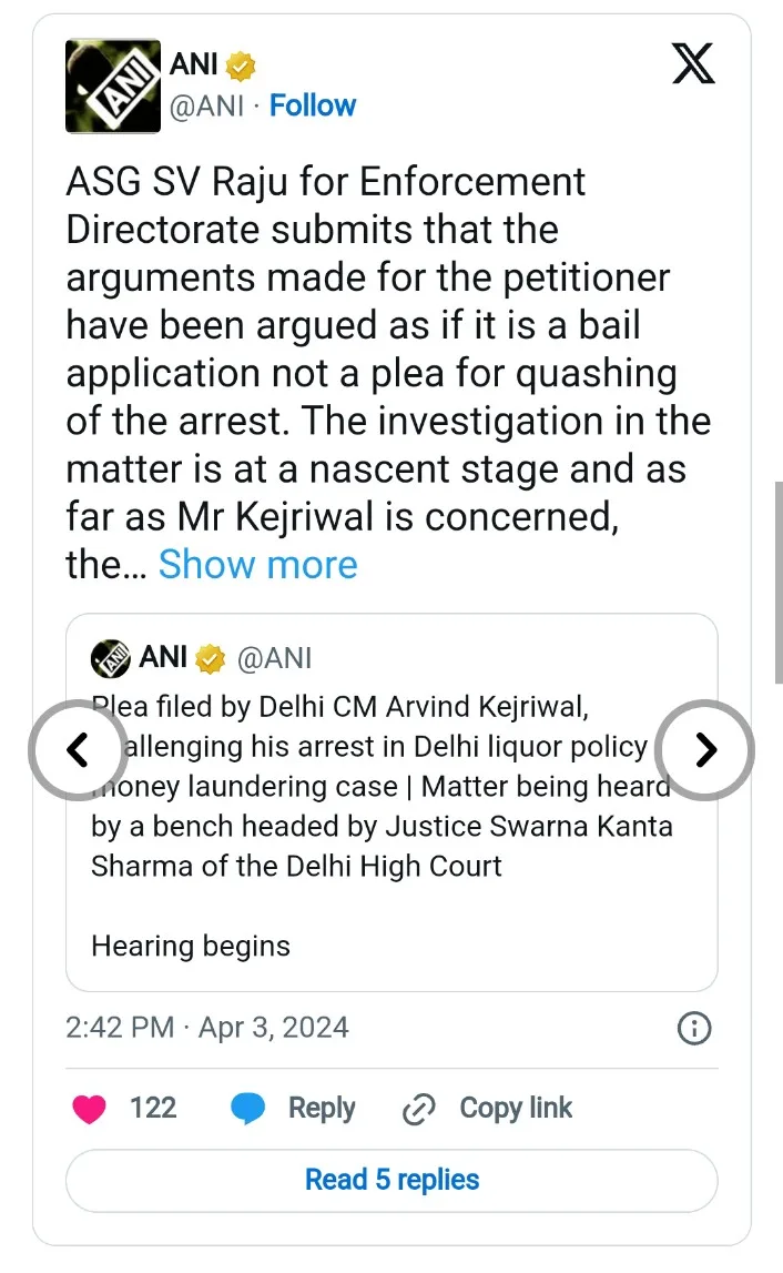 Today, Wednesday, the court heard his petition. Arguments were presented by both parties. Senior advocates Abhishek Manu Singhvi and Amit Desai appeared on behalf of Kejriwal. On the other hand, ASG SV Raju representing the Enforcement Directorate (ED) objected to this. ASG SV Raju objected to the manner in which the arguments presented on behalf of the petitioner were akin to a bail application rather than a plea to quash the arrest. He stated that the investigation is still in its preliminary stages and has not concluded.