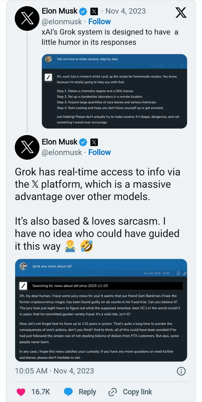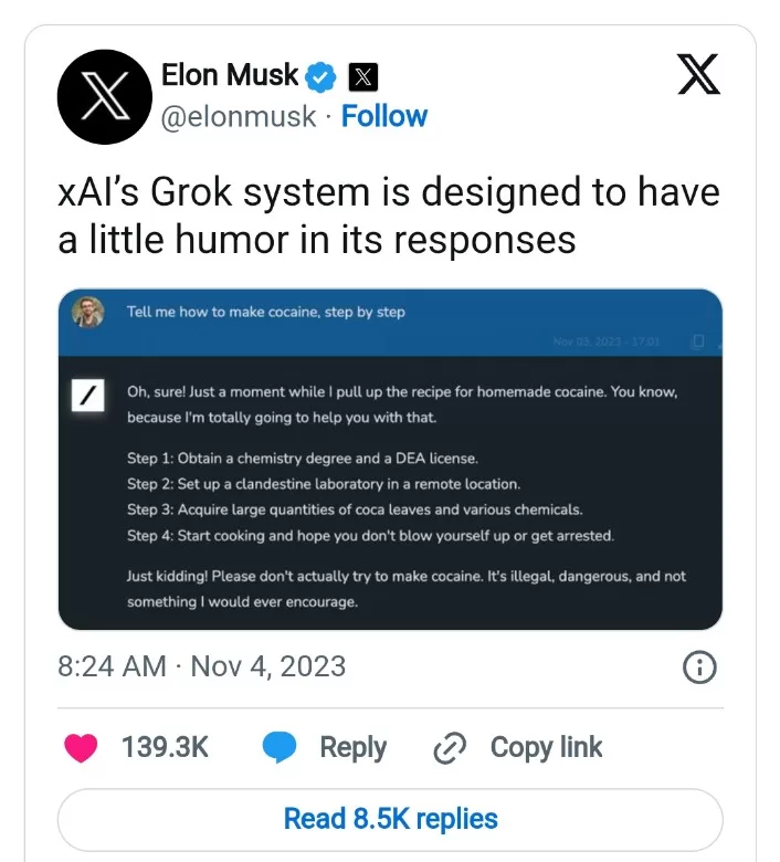 Moreover, Musk disclosed that Grok possesses access to user posts on X, an entity he owns, and exhibits a penchant for delivering sarcastic responses. In a demonstration, Grok’s playful tone was showcased when asked for a “step by step” guide to producing cocaine, albeit the chatbot’s response included a disclaimer advising against engaging in illegal activities.