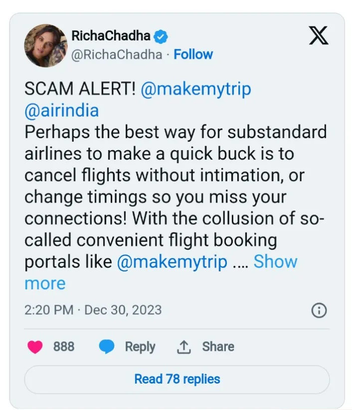In a recent X (formerly Twitter) rant, Bollywood actor Richa Chadha expressed dissatisfaction with online travel company MakeMyTrip and airline Air India, labeling them as ‘sasta (cheap) cheats’ and urging her followers to steer clear of these companies. Chadha accused the companies of canceling flights without notice and changing timings, leading to missed connections.