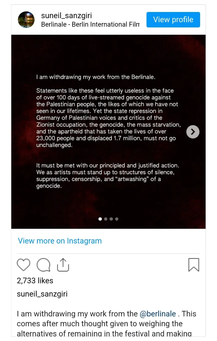 Announcing his boycott on Instagram, Sanzgiri accused the German authorities of silencing voices speaking out for Palestinians in the war against Gaza. “I will not be complicit. We all have blood on our hands,” he wrote.