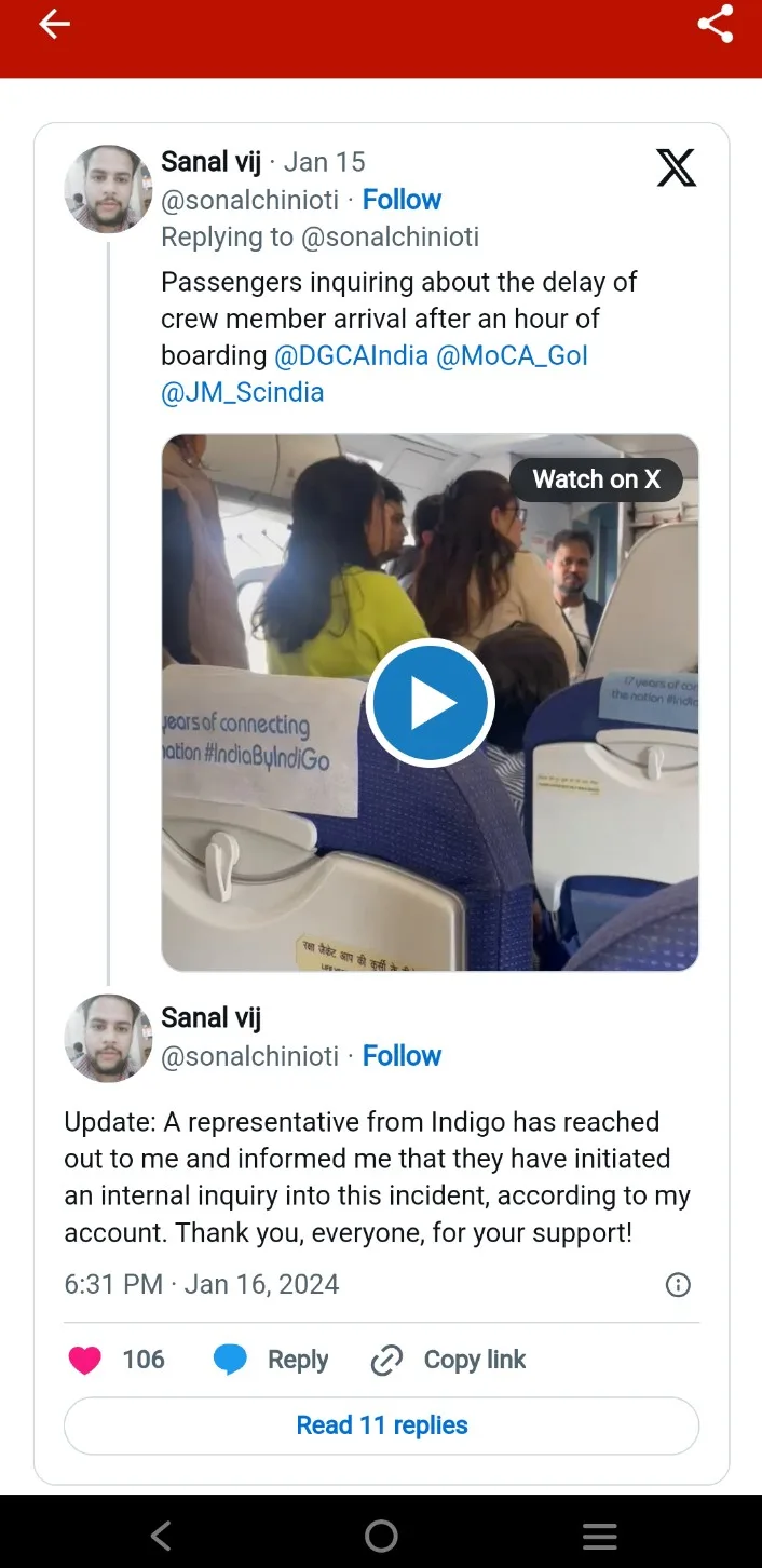 On Tuesday, Vij said — based on his account of the flight delay — “a representative from Indigo has reached out to me and informed me that they have initiated an internal inquiry into this incident.”