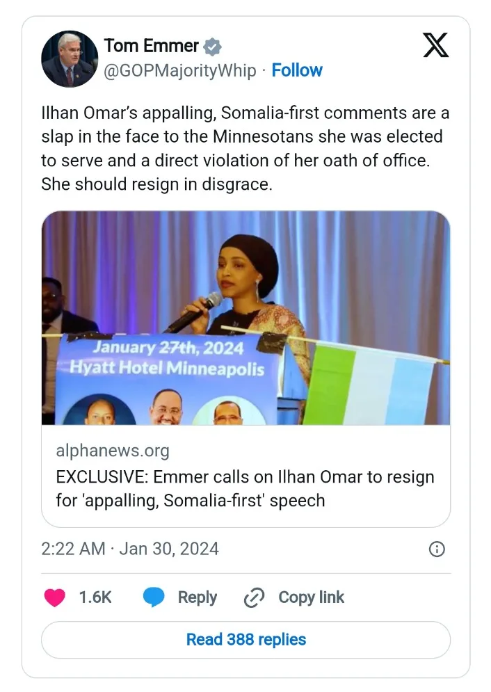 “Ilhan Omar’s appalling, Somalia-first comments are a slap in the face to the Minnesotans she was elected to serve and a direct violation of her oath of office,” House Majority Whip Tom Emmer wrote on X. “She should resign in disgrace.”