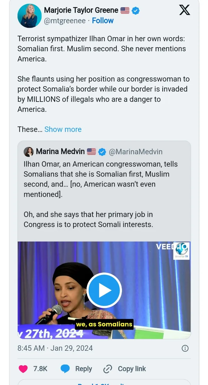 “Terrorist sympathizer Ilhan Omar in her own words: Somalian first. Muslim second. She never mentions America,” Greene posted on X.