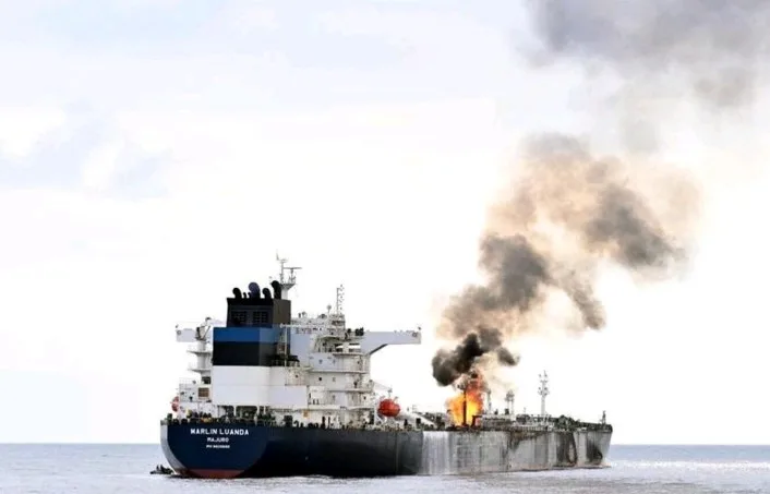 The Marlin Luanda burned for hours in the Gulf of Aden until being extinguished Saturday, said Trafigura, a Singapore-based trading firm. Its crew of 25 Indian nationals and two Sri Lankans were still trying to battle the blaze sparked by the missile strike, it said. No one was injured by the blast, it added.