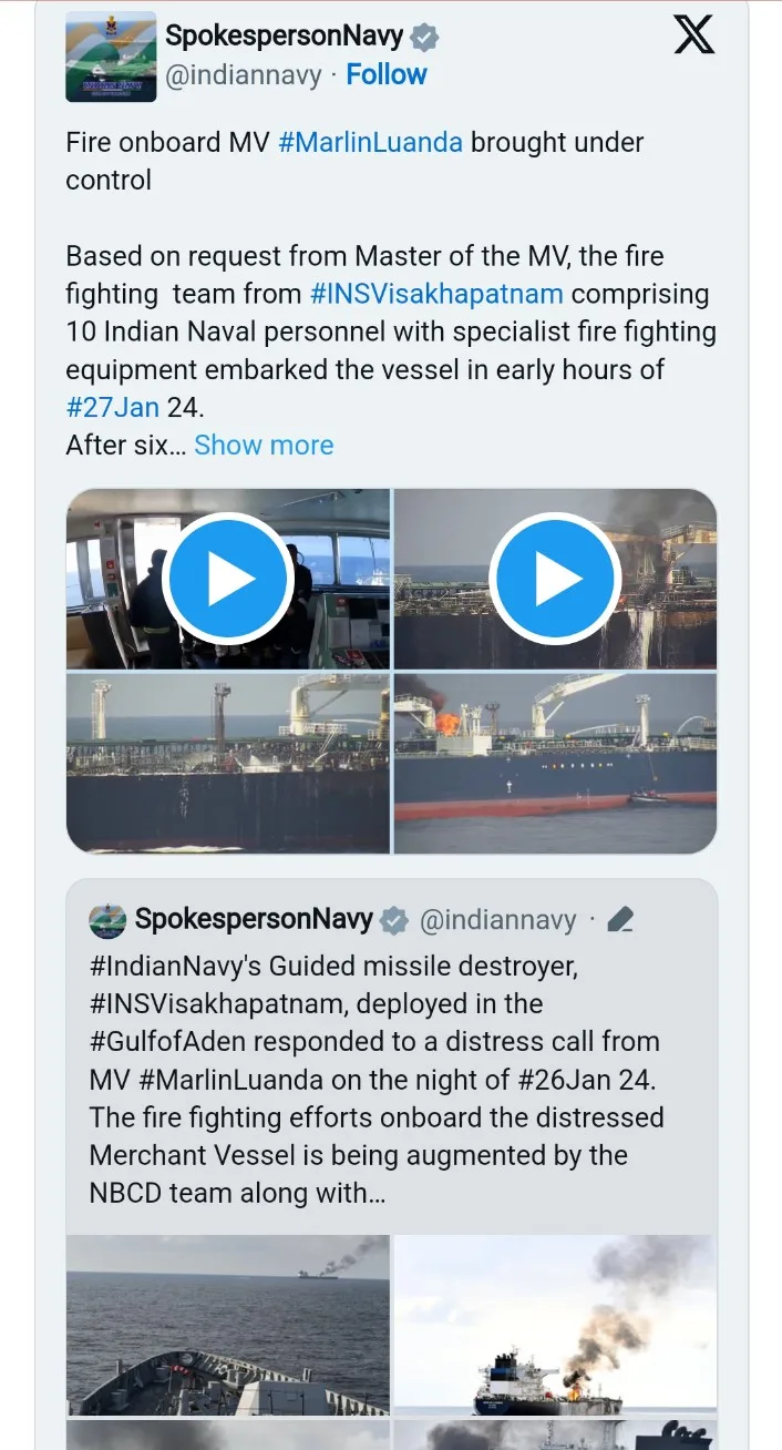 The Indian navy said its guided missile destroyer INS Visakhapatnam was assisting the Marlin Luanda’s crew in fighting the fire. It posted images showing the blaze still raging Saturday, likely fueled by the naphtha on board.