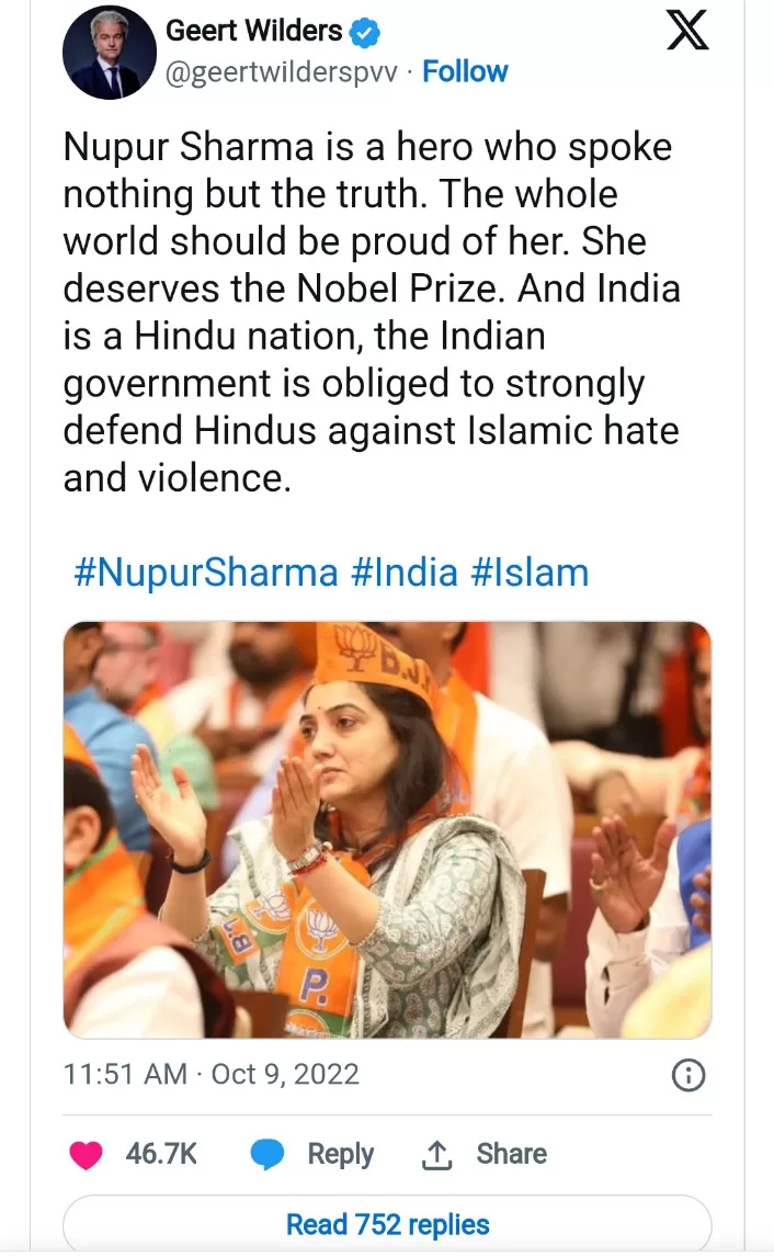 In 2022, Geert Wilders garnered attention for defending Bharatiya Janata Party (BJP) leader Nupur Sharma over her comments on Prophet Muhammad. His supportive tweet praised Sharma as a hero, triggering discussions about free speech and religious sensitivity.