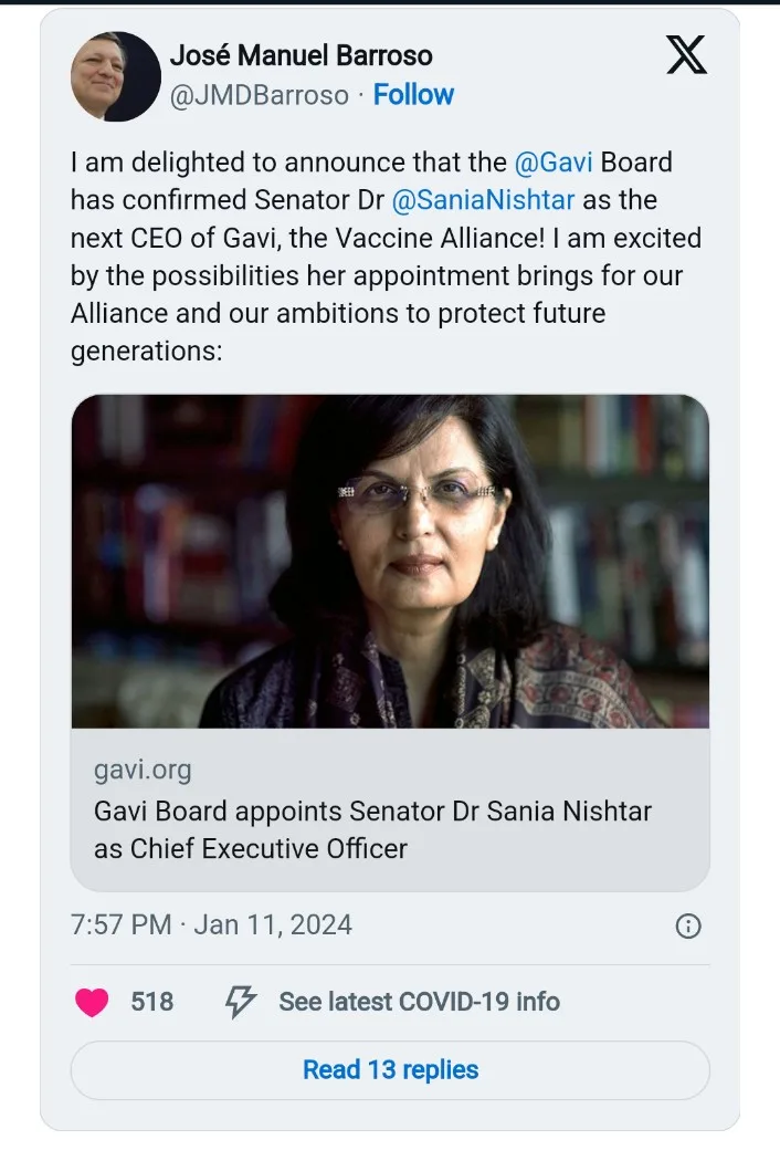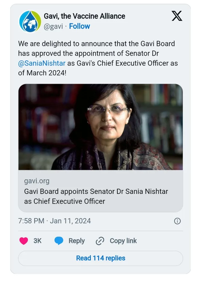 It quoted Professor José Manuel Barroso, Chair of the Gavi Board, as saying that Dr Nishtar had built a reputation as a “tireless advocate for health equity, an innovative thinker and a proven doer when it comes to solving complex challenges” over three decades of leadership at the national and global levels.