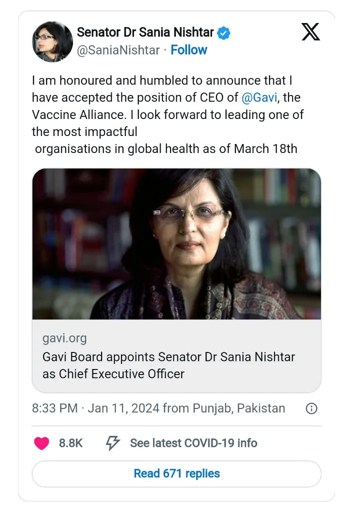 Gavi, the global vaccine alliance which played a crucial role in the Covid-19 pandemic, said in a press release issued today that Nishtar will assume office from March 18.
