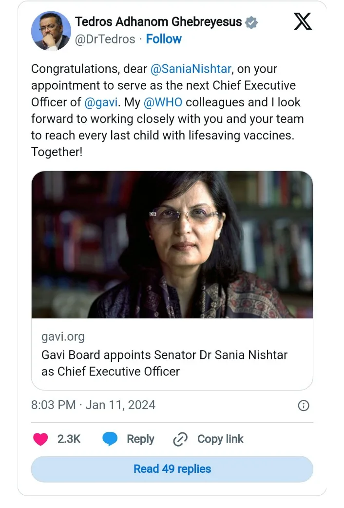 “I am honoured by the trust the Gavi board has placed in me and look forward to working with Gavi’s talented staff and skilled alliance partners to ensure Gavi reaches hundreds of millions of children in lower-income countries with life-saving vaccines against deadly and debilitating diseases,” Nishtar added.