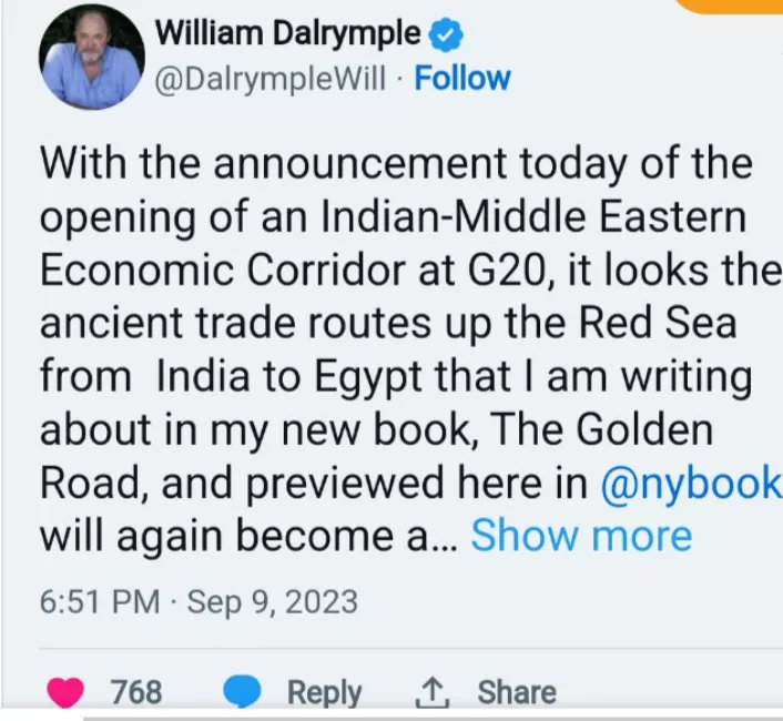 In a tweet shared on X (formerly Twitter), Dalrymple remarked, “With the announcement today of the opening of an Indian-Middle Eastern Economic Corridor at G20, it looks the ancient trade routes up the Red Sea from India to Egypt that I am writing about in my new book, The Golden Road, and previewed here in @nybooks, will again become a global focus of economic and cultural exchange.”