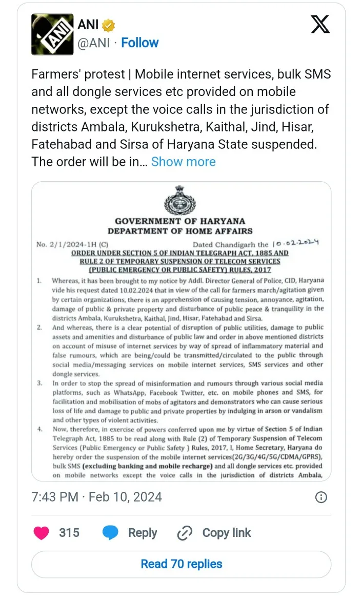 The decision to suspend mobile internet services, SMS, and all dongle services, excluding voice calls, aims to prevent communication and coordination among farmers planning to participate in the march. This move comes as a response to concerns over the possible disruption caused by the farmers’ protest, necessitating precautionary steps.