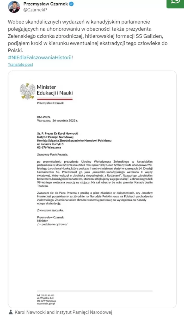 Poland’s education minister, Przemysław Czarnek, expressed his concerns, stating, “In view of the scandalous events in the Canadian Parliament, which involved honoring, in the presence of President Zelenskyy, a member of the criminal Nazi SS Galizien formation, I have taken steps towards the possible extradition of this man to Poland.”