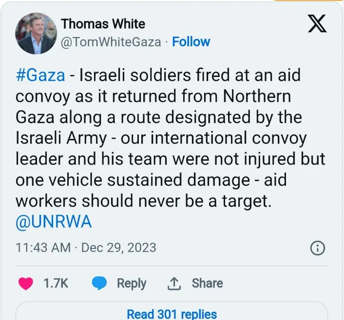 UNRWA’s director in Gaza, Tom White, confirmed the incident, stating that Israeli soldiers fired upon the convoy as it followed a route designated by the Israeli army. The convoy leader and team members escaped unharmed.