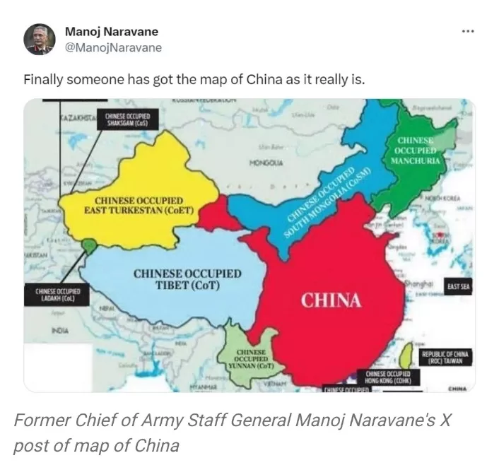 Former Chief of Army Staff General Manoj Naravane (retd) took a swipe at China on Tuesday by sharing a map on the X social media platform (formerly Twitter), along with the caption, “Finally someone has got the map of China as it really is.”