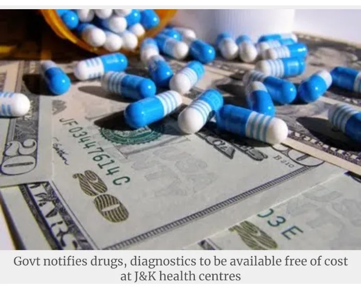 According to an order at least 65 drugs and 38 diagnostics will now be available free of cost in Primary Health Centres and Sub-Centres across Jammu and Kashmir with immediate effect.