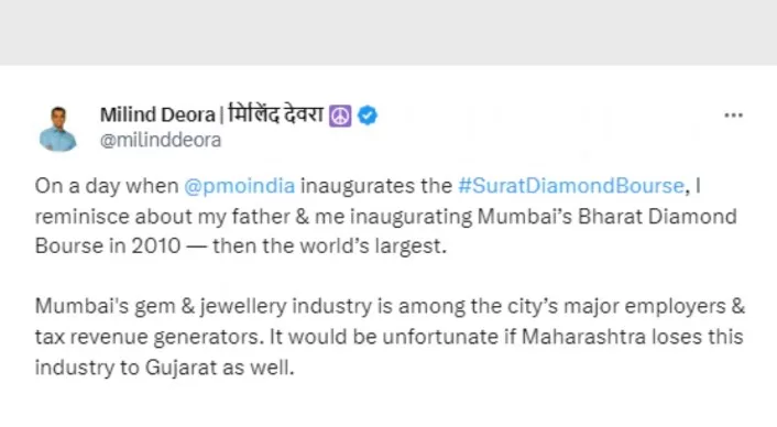 In the wake of Prime Minister Narendra Modi’s inauguration of the Surat Diamond Bourse, Congress leader Milind Deora voiced concerns about the potential loss of the diamond industry from Maharashtra to Gujarat. Deora emphasized the significance of Mumbai’s gem and jewellery sector, expressing apprehension about the industry shifting to Gujarat.