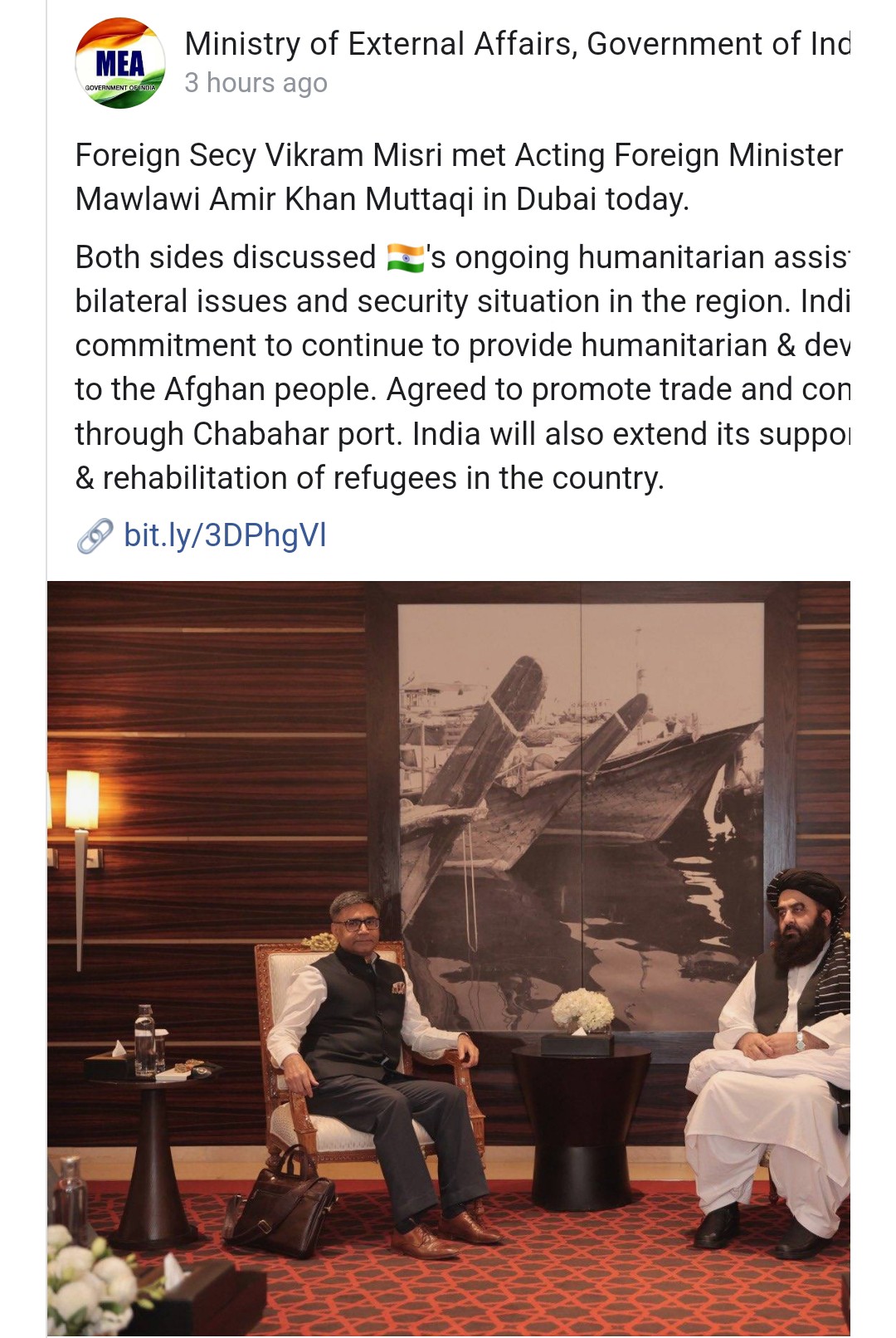 It further said that the Indian foreign secretary “praised the Islamic Emirate’s fight against drugs and corruption in the country” and added that India was willing to expand relations with Afghanistan in the political and economic fields and to promote trade through Chabahar port in Iran.