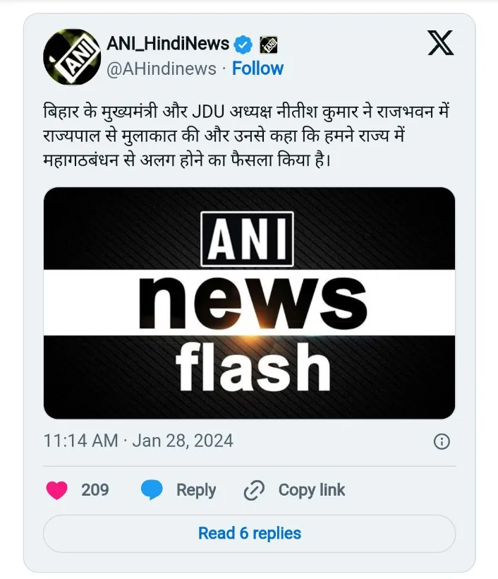According to news agency ANI, Chief Minister Nitish Kumar had requested a meeting with the Governor on Sunday morning, adding a layer of intrigue to the unfolding political drama. With the collapse of the Mahagathbandhan government in Bihar, it is now confirmed that JDU has parted ways. The reins of power in the state will return to the NDA, with Nitish Kumar set to lead the government. Sunday will witness Nitish Kumar forming a government in collaboration with the BJP, as he has submitted his resignation to the Governor.