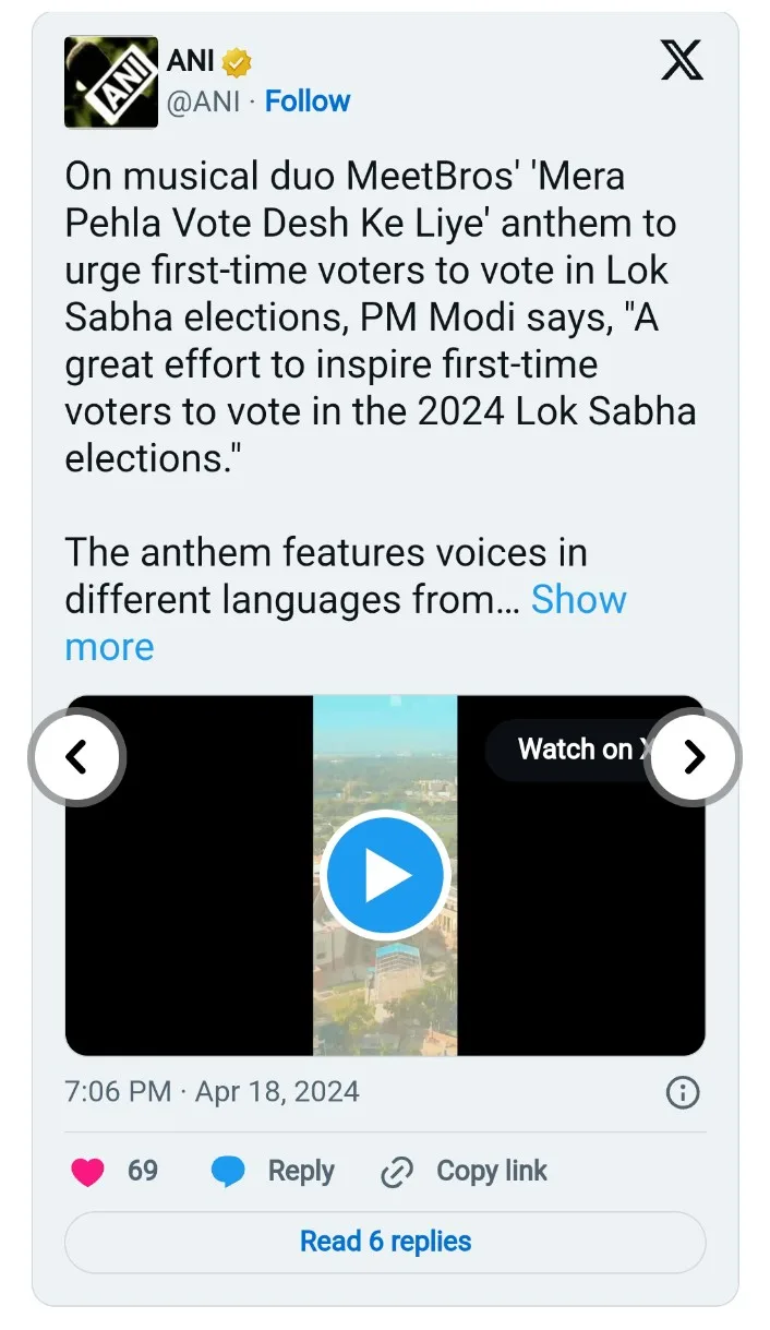 In a bid to motivate voters for the upcoming 2024 Lok Sabha elections, Prime Minister Modi took to social media to share a post featuring the viral video of the song “Mera Pehla Vote Desh Ke Liye” by Meet Bros.