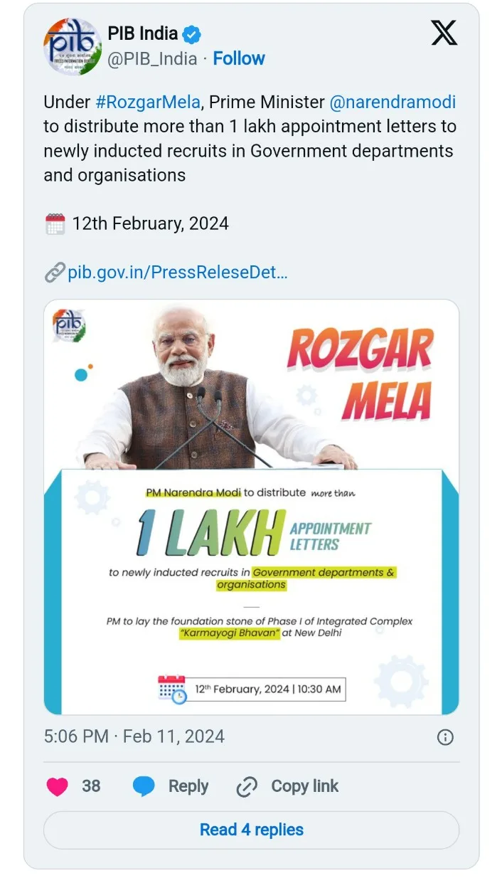 In a statement released by the Prime Minister’s Office (PMO), it was announced that PM Modi will conduct a video conference on February 12 at 10:30 AM, distributing appointment letters to more than a hundred thousand newly appointed candidates.