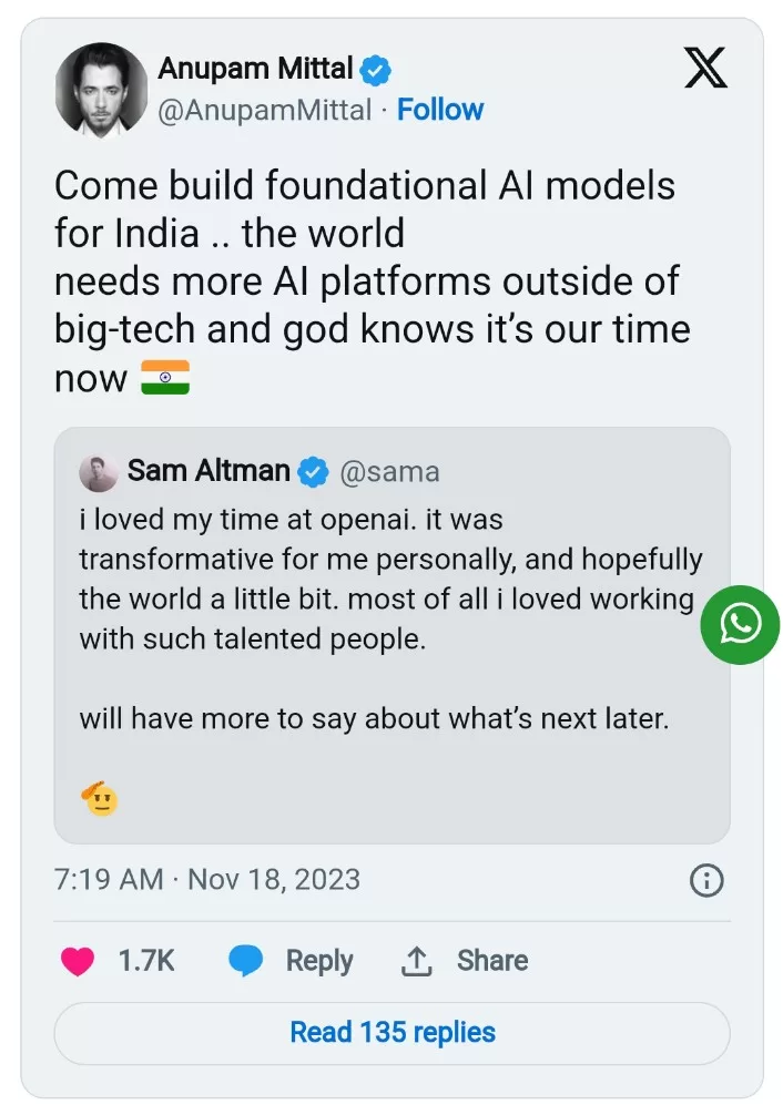 Mittal, in response to Altman’s tweet, suggests, “Come build foundational AI models for India… the world needs more AI platforms outside of big-tech, and god knows it’s our time now.”