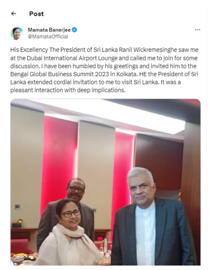 In response to her invitation, Mamata Banerjee posted on the X platform (formerly Twitter), “His Excellency the President of Sri Lanka, Ranil Wickremesinghe, encountered me at the Dubai International Airport Lounge and initiated a discussion. I have been deeply humbled by his warm greetings and have invited him to the Bengal Global Business Summit 2023 in Kolkata.” She further disclosed that Wickremesinghe has extended an invitation to her to visit Sri Lanka.