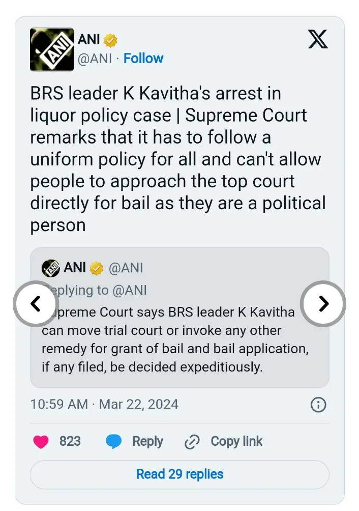 The Supreme Court has refused bail to BRS leader K. Kavitha on Friday. She was arrested by the Enforcement Directorate (ED) in connection with the Delhi Excise Policy scam. Following her arrest, she had approached the top court for bail. However, the court directed Kavitha to go to the lower court for bail, stating that it must adhere to a uniform policy for everyone and cannot allow direct approaches for bail in political cases.
