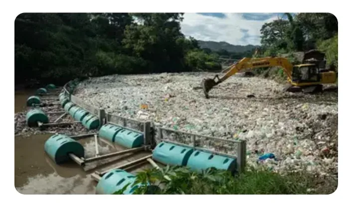 The plastic trash interceptor consists of two booms- one in upstream and one in downstream. The upstream boom address majority of pressure and plastics. The downstream boom captures the mixed plastics due to pressure build-up and causes rapid accumulation of trash during severe floods. Excavators will then gather the accumulated plastic and transported to the shore for disposal and recycling.