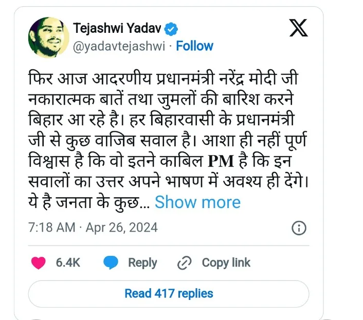Former Deputy Chief Minister and Bihar Assembly Leader of the Opposition, Tejashwi Yadav, has directed seven questions at Prime Minister Narendra Modi ahead of his Bihar visit. Yadav took to social media to post these questions, stating that PM Modi is coming to Bihar to shower negative remarks and empty promises. He mentioned that these questions are on behalf of the people of Bihar and expects the Prime Minister to address them in his speeches.