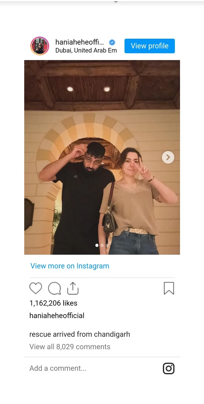 In addition to the video, Hania treated her fans to snapshots of their time together in Dubai, including candid poses and glimpses of their delectable dinner. A playful clip shared by Badshah featured Hania sitting beneath a tree with her coffee, humorously captioned by her as “Rescue arrived from Chandigarh.”