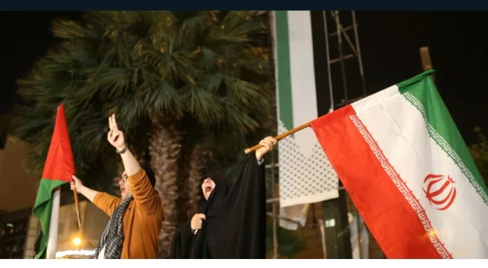 Hundreds of Iranians gathered in Tehran’s Palestine Square, waving Iranian and Palestinian flags to celebrate the unprecedented military action against Israel.