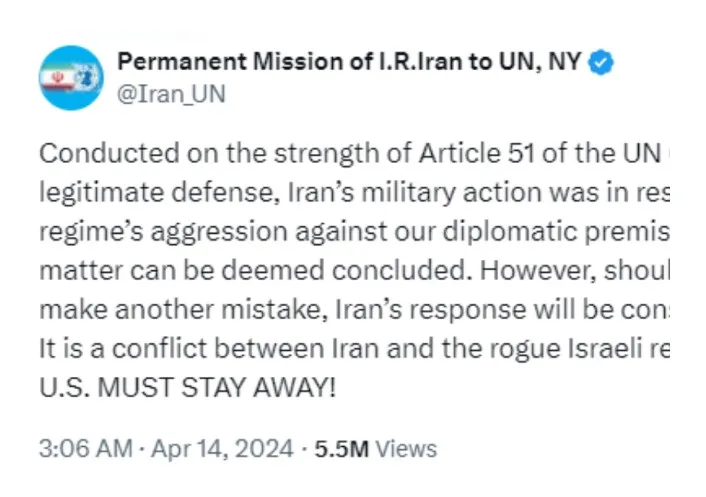 The Iranian mission to the United Nations warned Washington to keep out of Iran’s conflict with Israel. “It is a conflict between Iran and the rogue Israeli regime, from which the US MUST STAY AWAY!” it said.