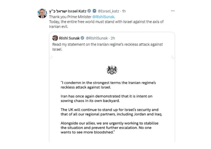 British Prime Minister Rishi Sunak condemned Iran’s “reckless” action and pledged his government would “continue to stand up for Israel’s security”. The defence ministry said it had moved several additional fighter jets to the region which stood ready to “intercept any airborne attack within range”.