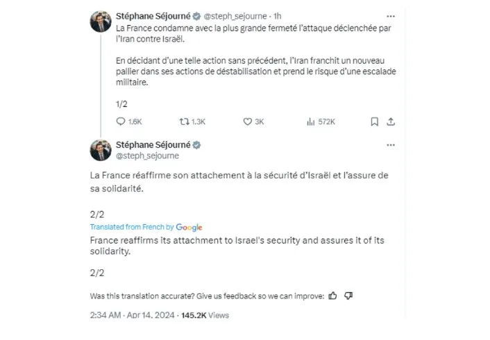 France echoed its commitment to Israel’s security. “In deciding to take this unprecedented action, Iran has reached a new level of destabilisation,” Foreign Minister Stephane Sejourne said.