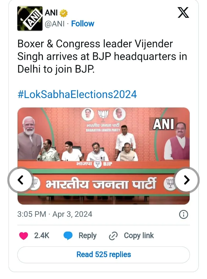 Vijender Singh joined the BJP in the presence of BJP General Secretary Vinod Tawde and Ramvir Singh Bidhuri, the opposition leader in the Delhi Assembly and BJP’s candidate from South Delhi. Vijender Singh belongs to the Jat community, which holds significant political influence in Haryana, Western Uttar Pradesh, and Rajasthan. He won a bronze medal in boxing at the 2008 Beijing Olympics and has clinched several other medals for the country in various international competitions.