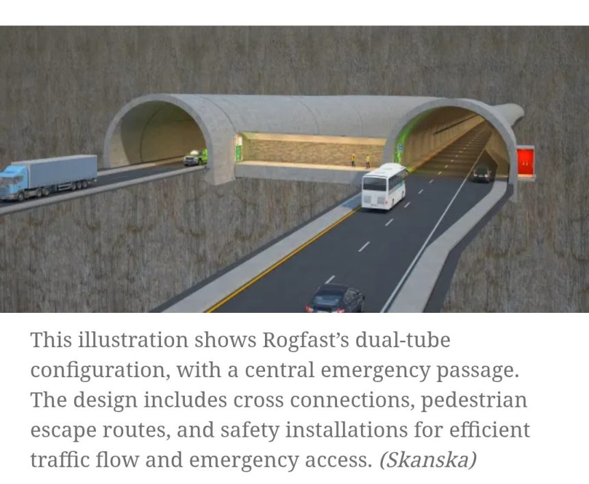 Ventilation will combine longitudinal jet-fan systems with dedicated shafts to the island of Kvitsøy, where a novel underwater double roundabout — 260 metres beneath the surface — will provide access to Norway’s smallest municipality.