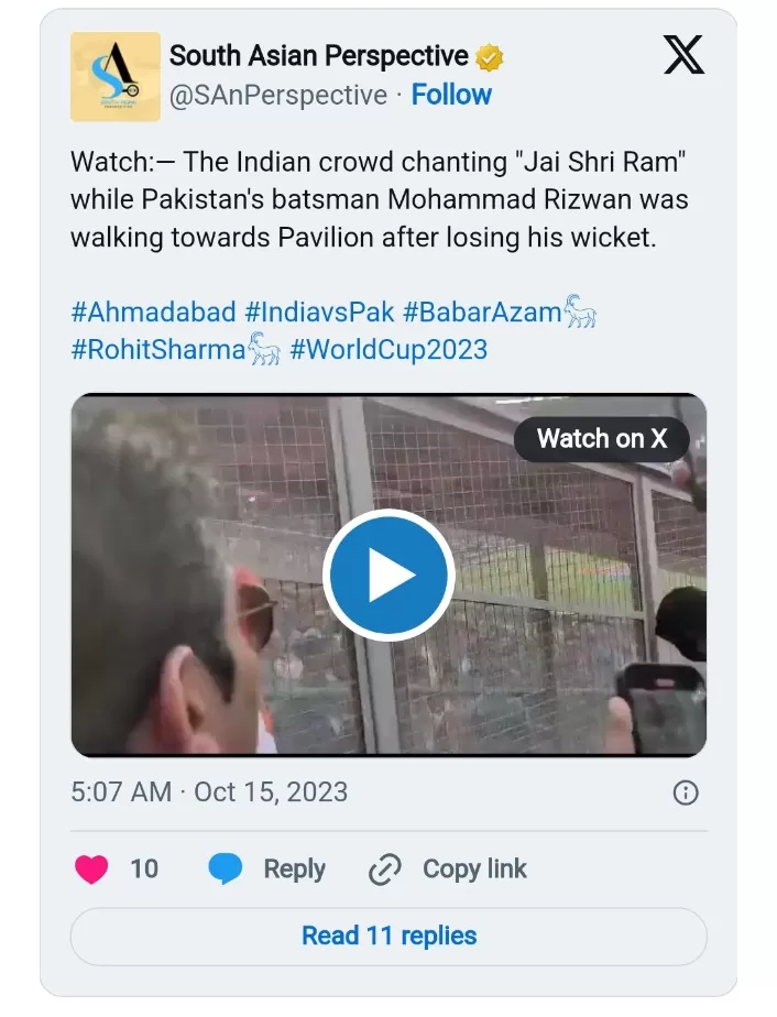 Furthermore, a widely circulated video depicted Indian fans passionately chanting “Jai Shri Ram” at Mohammad Rizwan as he walked back to the pavilion following his dismissal.