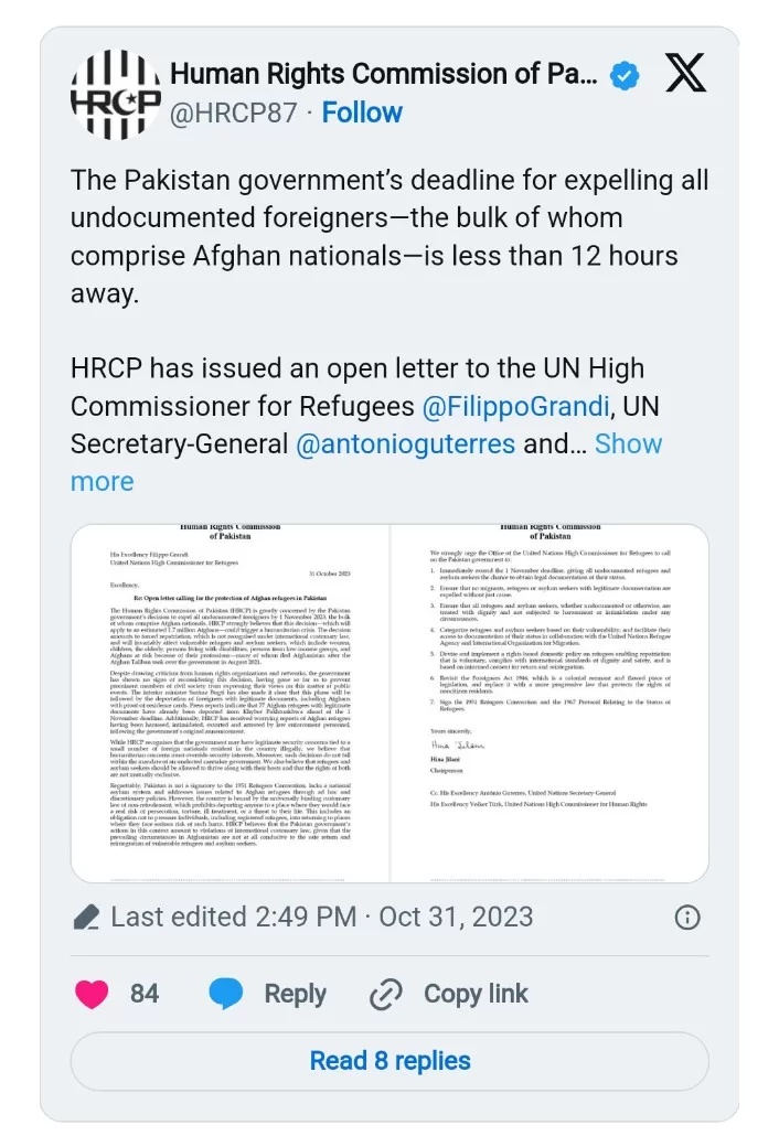 The HRCP concluded by urging the UNHCR to call on the Pakistani government to extend the November 1 deadline, ensure that migrants and refugees with legitimate documentation are not expelled, guarantee that refugees are treated with dignity, and facilitate their access to proper documentation. The letter also called for the development of a “rights-based domestic policy” on refugees, a review of the “flawed” Foreigners Act of 1946, and Pakistan’s accession to the 1951 Refugee Convention and the 1967 Protocol Relating to the Status of Refugees.