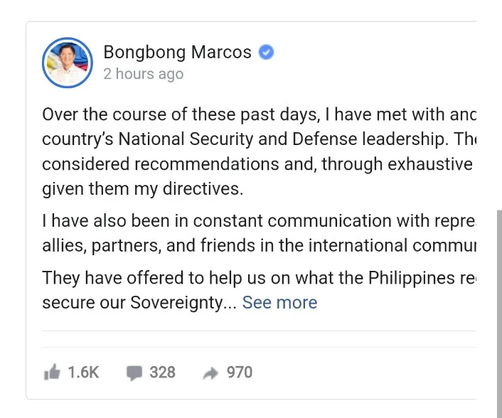 “We seek no conflict with any nation, more so nations that purport and claim to be our friends, but we will not be cowed into silence, submission, or subservience,” Marcos said on Facebook.