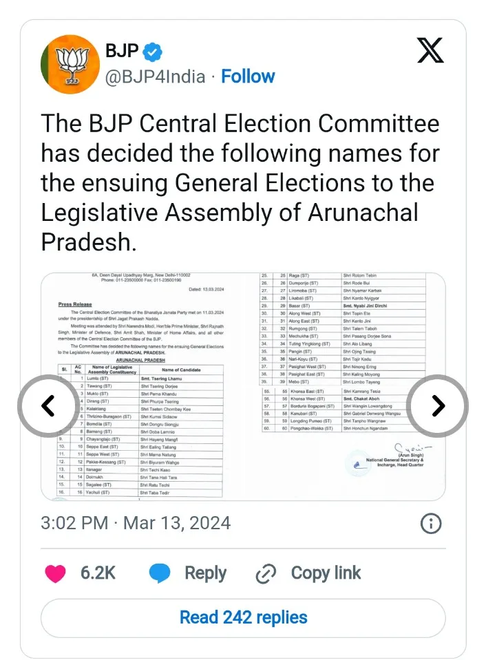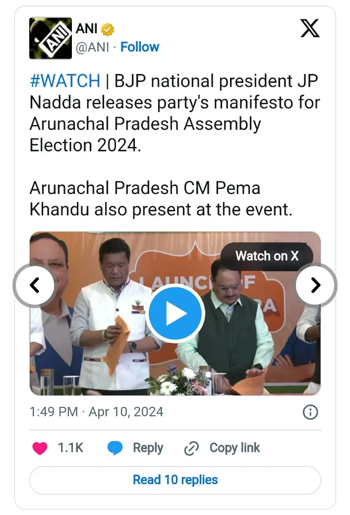 The Bharatiya Janata Party (BJP) has released its manifesto for the 2024 Arunachal Pradesh Assembly Election. The manifesto, titled “Developed India, Developed Arunachal Pradesh,” was issued by the party’s national president JP Nadda and Arunachal Pradesh Chief Minister Pema Khandu.