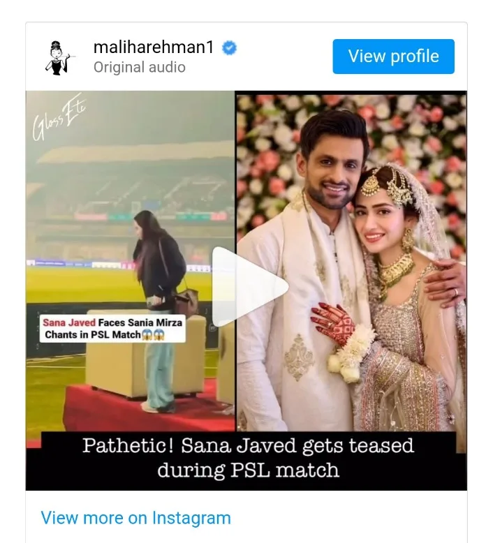 Sana Javed attended a Pakistan Super League (PSL) match between the Karachi Kings and Multan Sultans on Sunday to support her husband Shoaib Malik. However, at the stadium, the actor was met with spectators chanting Sania Mirza’s name — whom Malik separated from earlier this year.