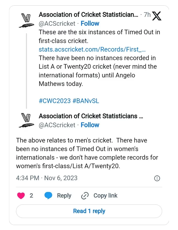 The Association of Cricket Statisticians and Historians confirmed that there have been six instances of “timed out” in first-class cricket. Notably, there had been no documented occurrences of this ruling in List A or Twenty20 cricket until Angelo Mathews’ unique dismissal.